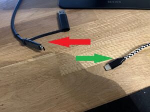 Flèche verte : Le câble USB C zébré sert a charger les appareils classiques.